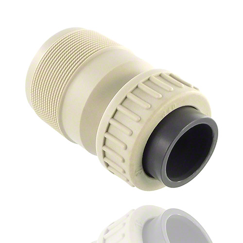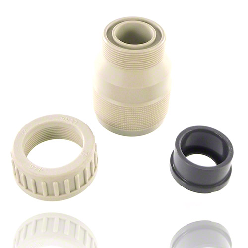 - andere Seite PP Überwurfmutter mit PVC U Einlegeteil Klebemuffe und  EPDM O-Ring Abdichtung