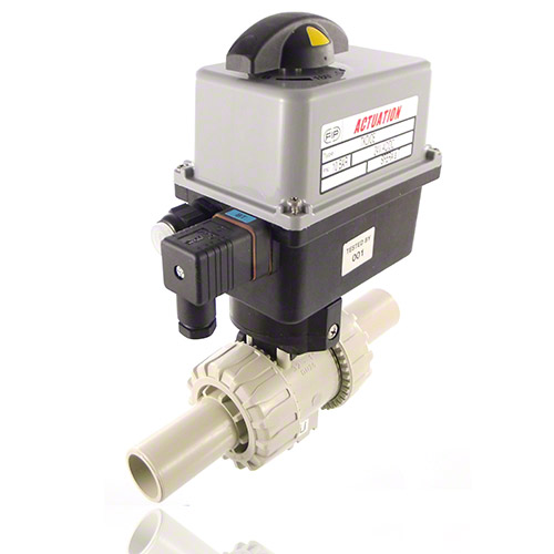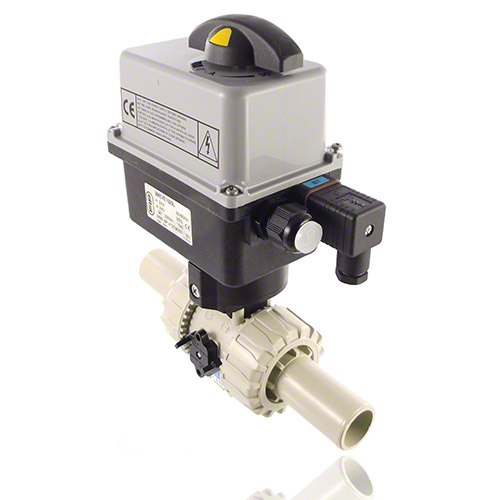 2/2-Wege-Kugelhahn mit gesicherten Überwurfmuttern aus PP mit elektrischem Stellantrieb