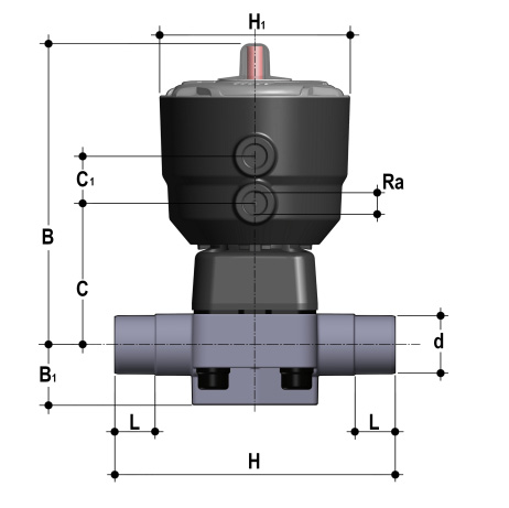 | 2/2-Wege-Membranventil mit pneumatischem Kolben-Stellantrieb mit optischer Stellungsanzeige maximierter Durchfluss Gehäusewerkstoff: PP Funktion: doppelt wirkend (DA) Membranwerkstoff: PTFE/EPDM Steuerdruck: max. 5 bar Steueranschluss (Ra): G 1/4' Antriebsfarbe: schwarz (mit grauer Haube) Steueranschluss in Durchflussrichtung Betriebsdruck: einseitig anstehend Anschluss: Schweißstutzen zum Heizelementmuffenschweißen |